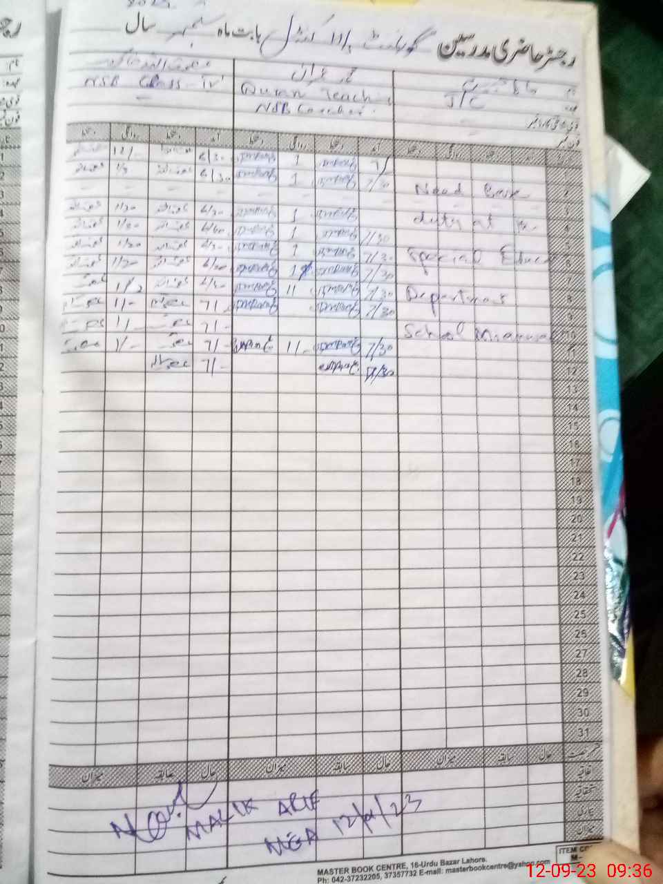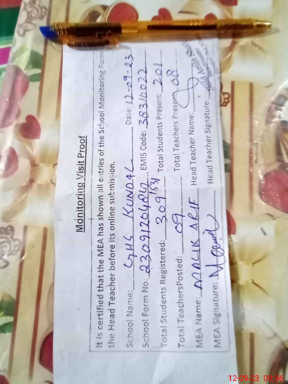 | Attendance Register | Head Teacher | MEA with School | Visit Proof |