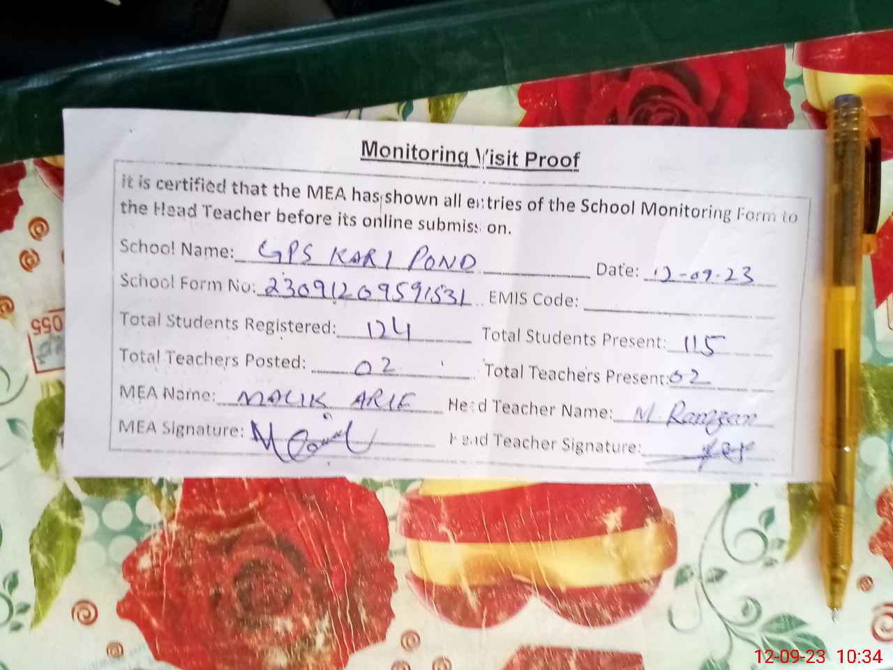 | Attendance Register | Head Teacher | MEA with School | Visit Proof |
