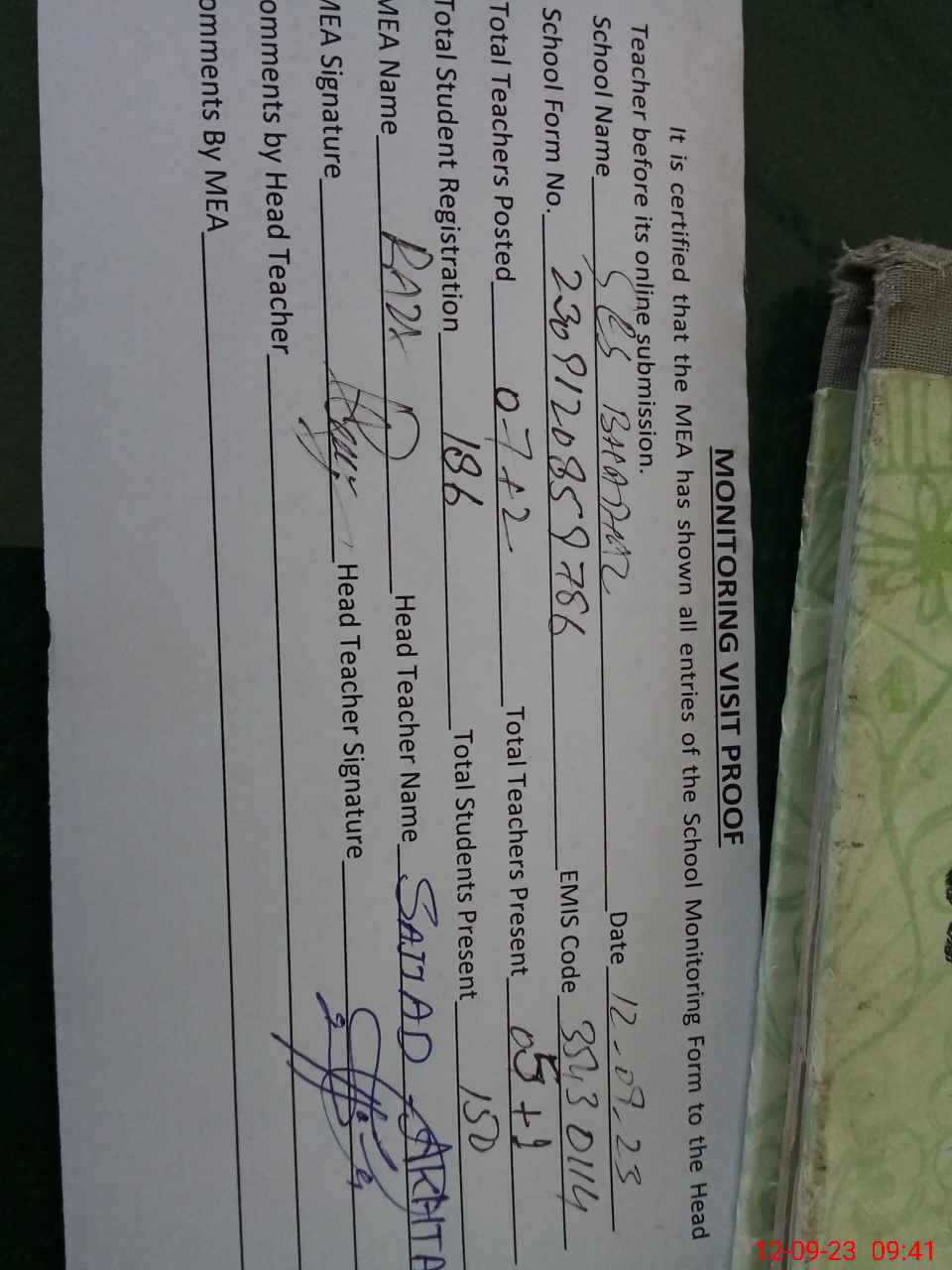 | Attendance Register | Head Teacher | MEA with School | Visit Proof |