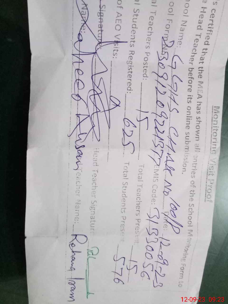 | Monitoring Date: 12-09-2023 | Start Time: 12-09-2023 07:52 AM | End Time: 12-09-2023 09:26 AM | Name of MEA: Za**** Ah**** | |