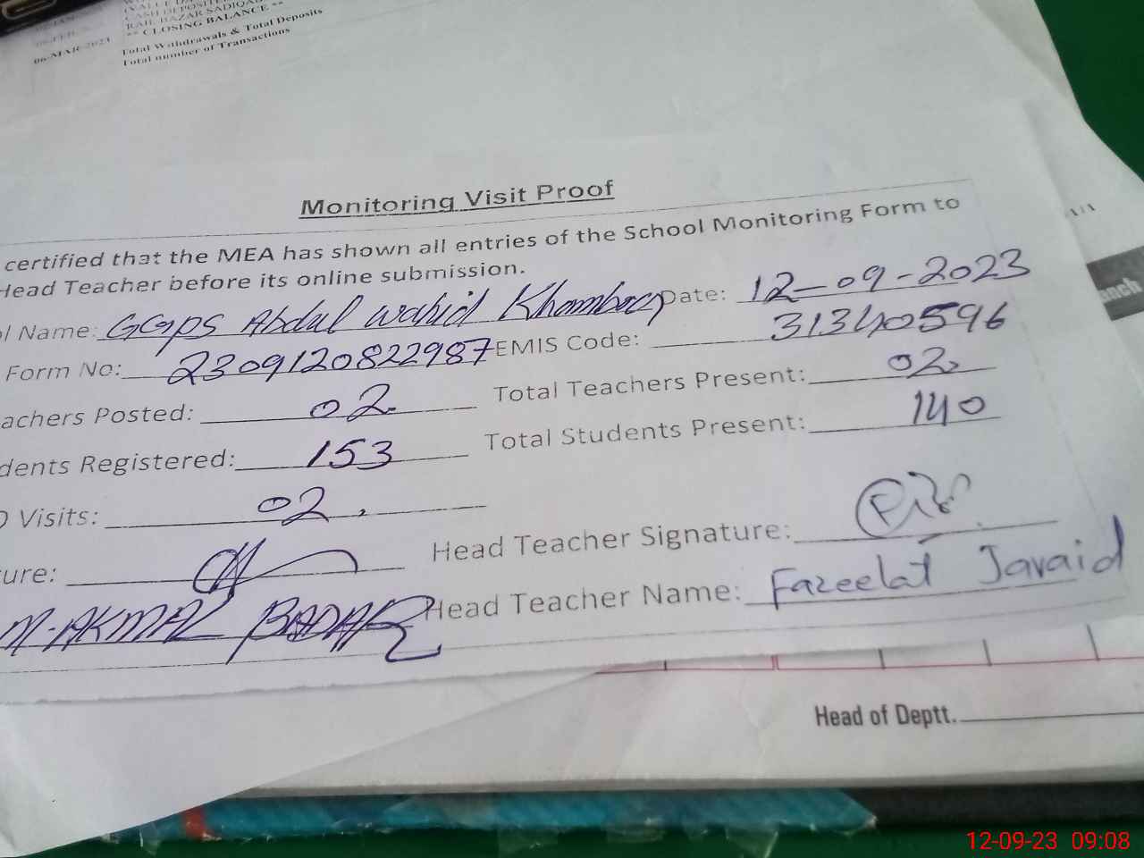 | Attendance Register | Head Teacher | MEA with School | Visit Proof |