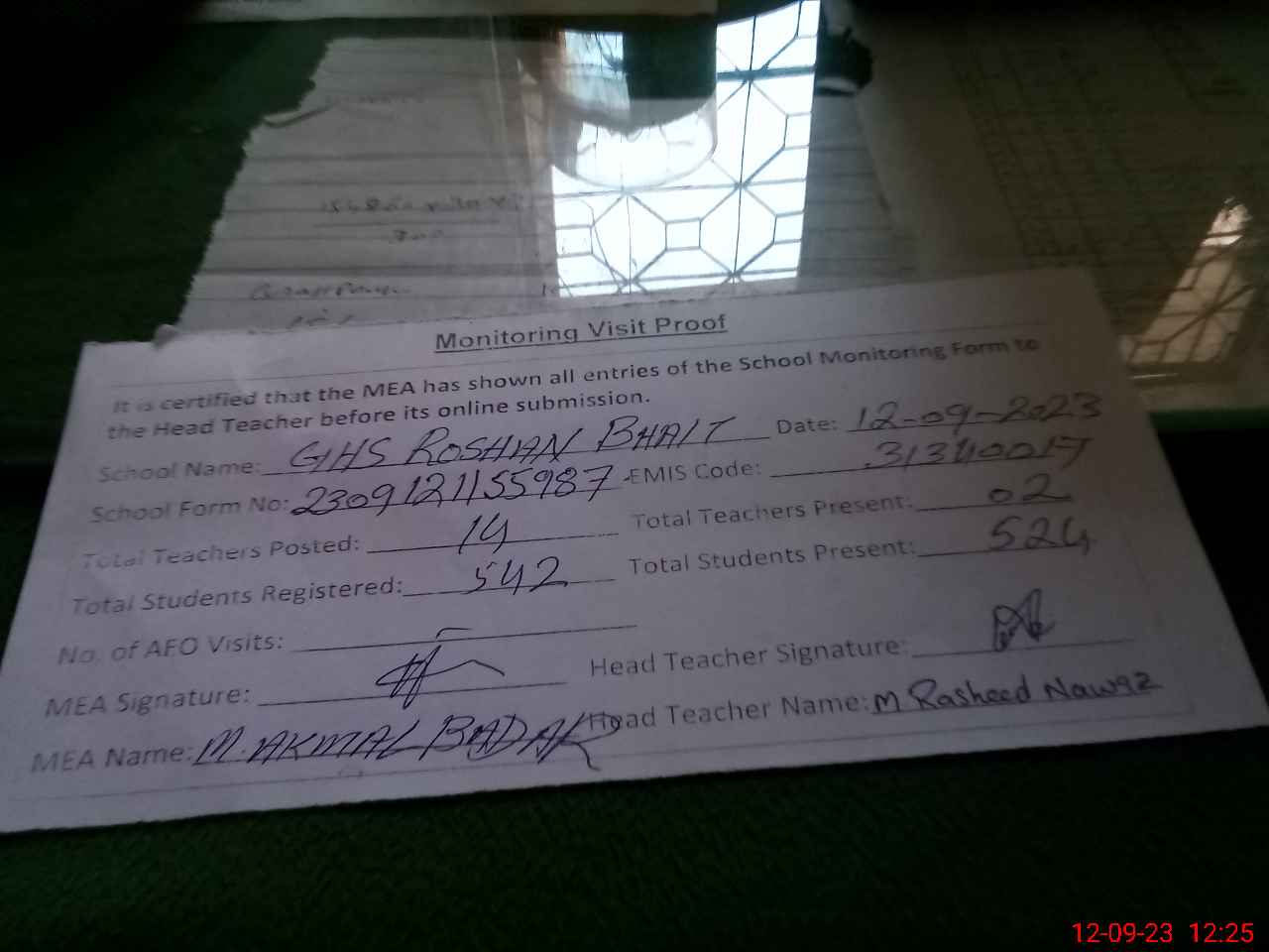 | Attendance Register | Head Teacher | MEA with School | Visit Proof |