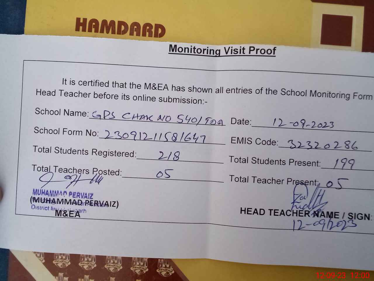 | Attendance Register | Head Teacher | MEA with School | Visit Proof |