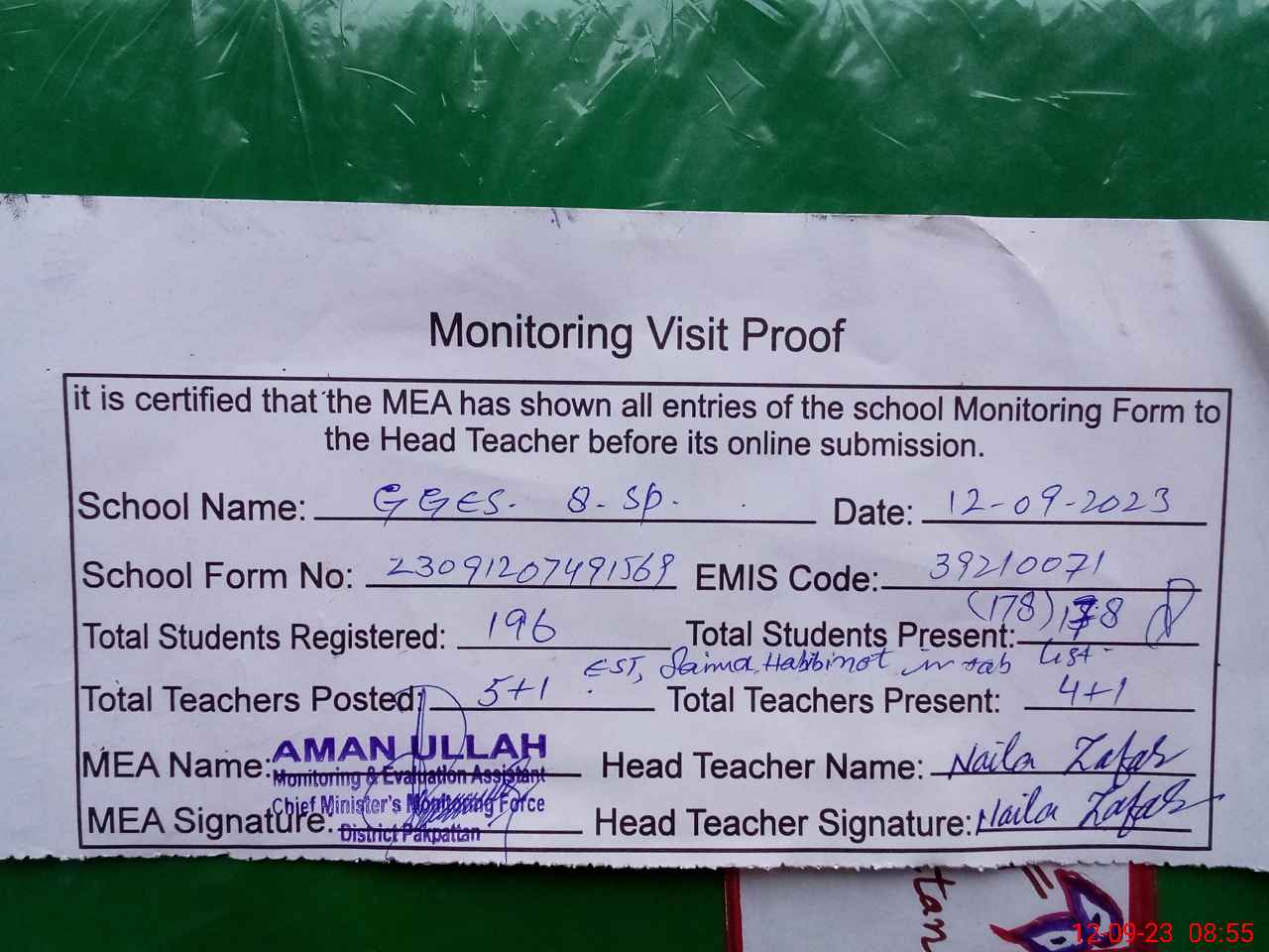 | Attendance Register | Head Teacher | MEA with School | Visit Proof |