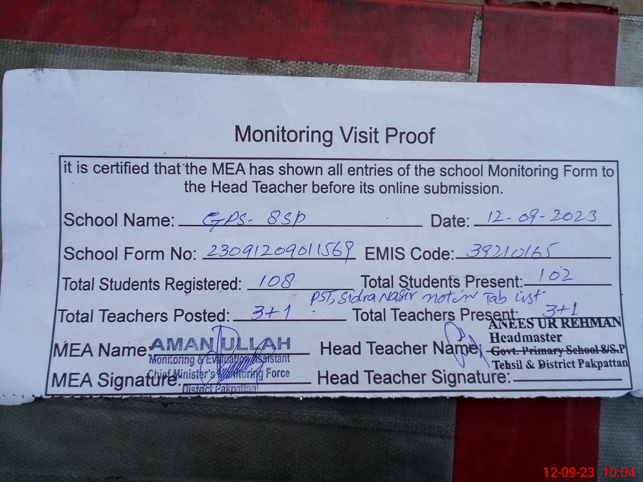 | Attendance Register | Head Teacher | MEA with School | Visit Proof |