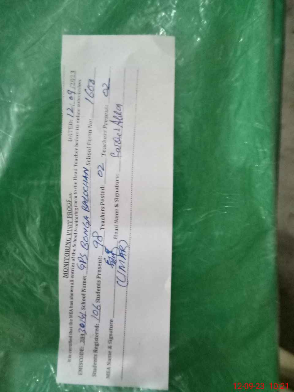 | Attendance Register | Head Teacher | MEA with School | Visit Proof |