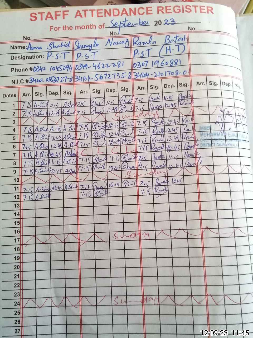 | CNIC | Full Name | Designation | R/C | Absence During Last Calender Month |
