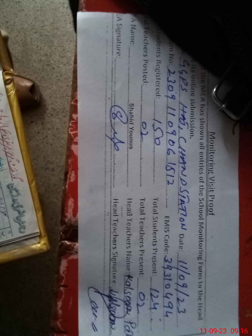 | Attendance Register | Head Teacher | MEA with School | Visit Proof |