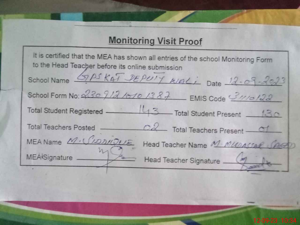 | Attendance Register | Head Teacher | MEA with School | Visit Proof |