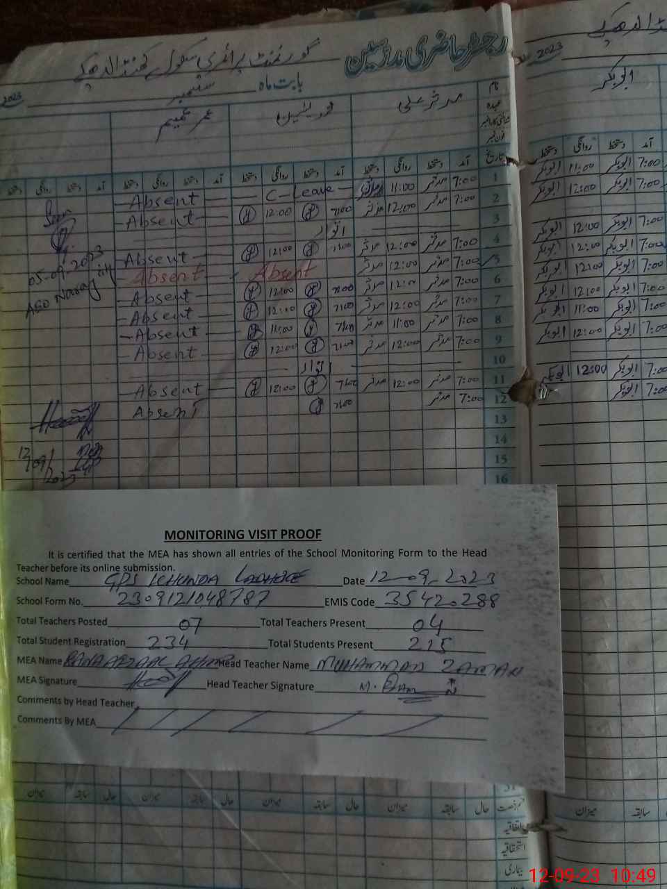 | Attendance Register | Head Teacher | MEA with School | Visit Proof |