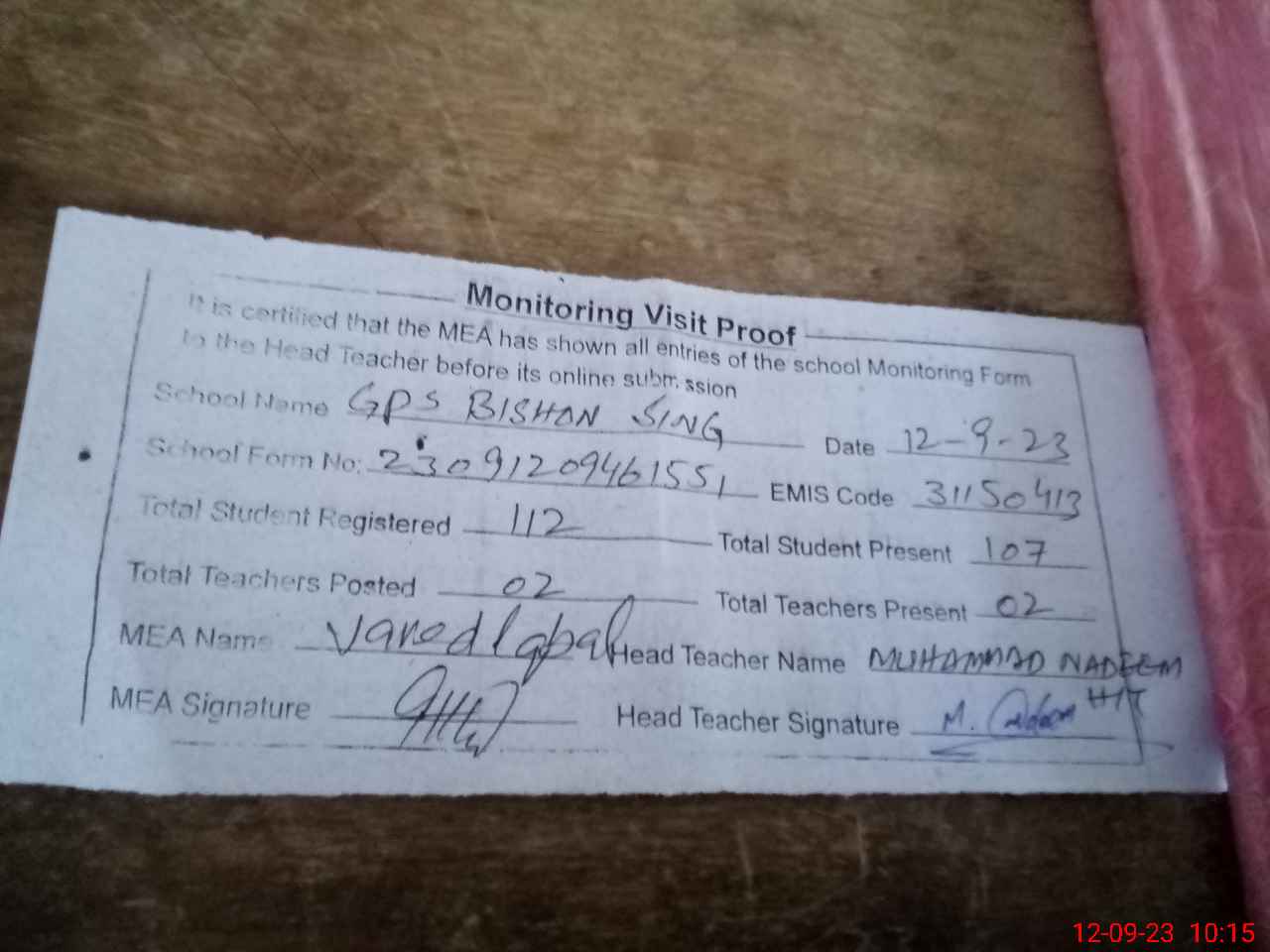 | Attendance Register | Head Teacher | MEA with School | Visit Proof |