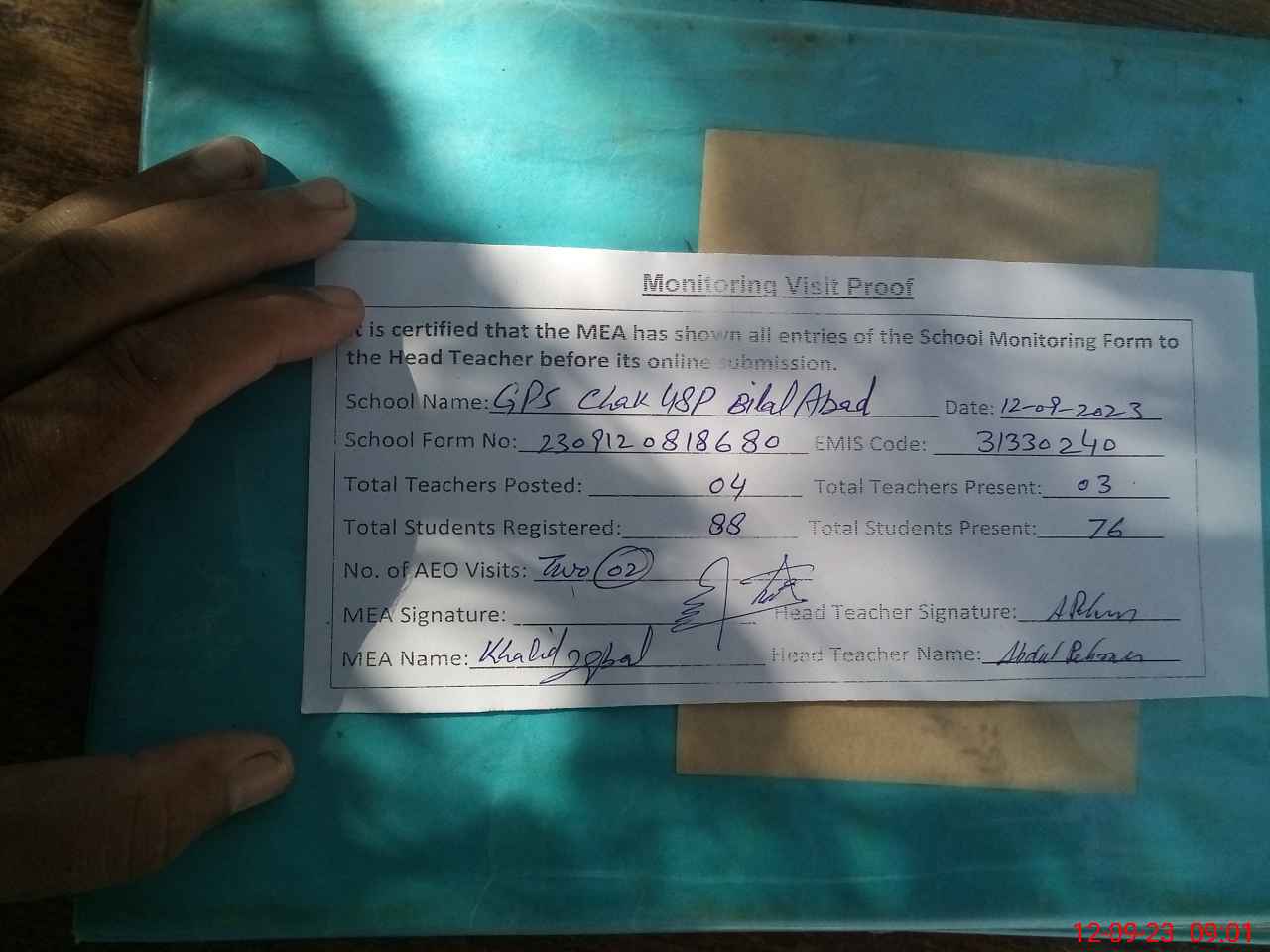 | Attendance Register | Head Teacher | MEA with School | Visit Proof |