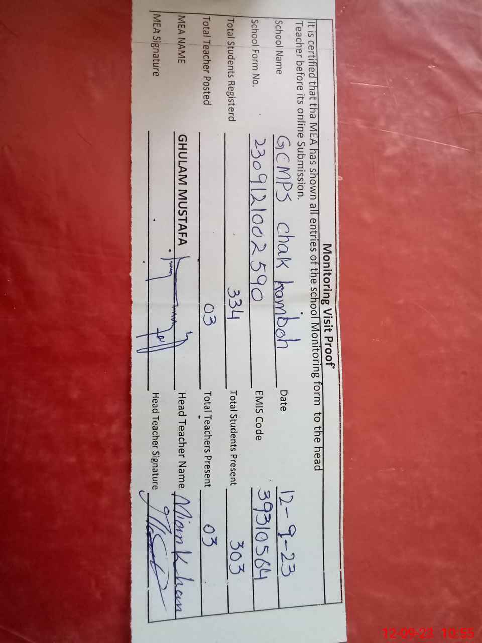 | EMIS Code: 39310564 | Name of School: GCMPS CHAK KAMBOH | |||