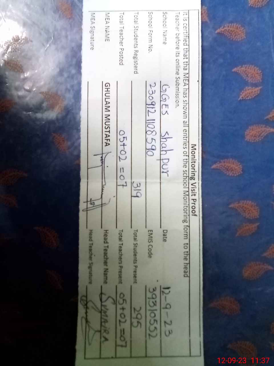 | Attendance Register | Head Teacher | MEA with School | Visit Proof |