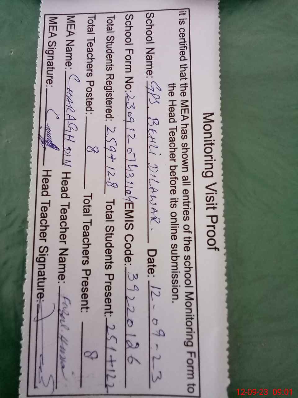 | EMIS Code: 39220126 | Name of School: GPS BEHLI DILAWAR | |||