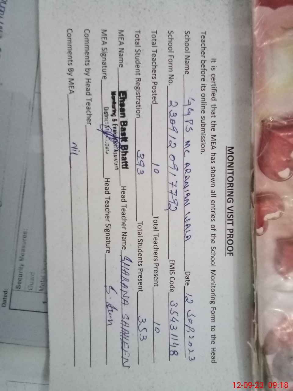 | Attendance Register | Head Teacher | MEA with School | Visit Proof |