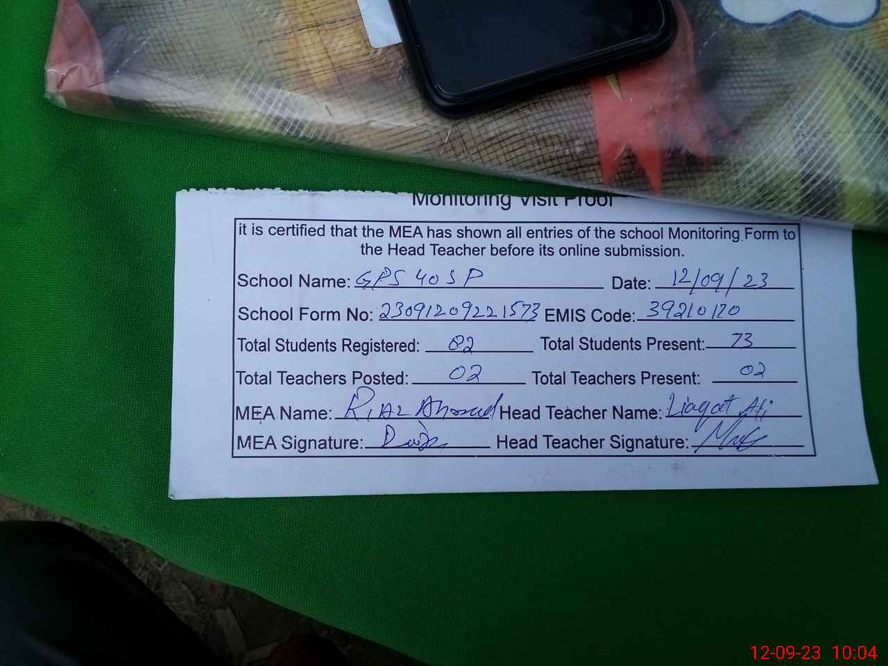 | Attendance Register | Head Teacher | MEA with School | Visit Proof |