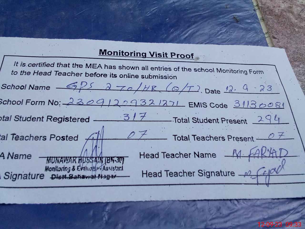 | EMIS Code: 31130081 | Name of School: GPS CHAK NO.270/HR QADIR TOWN | |||
