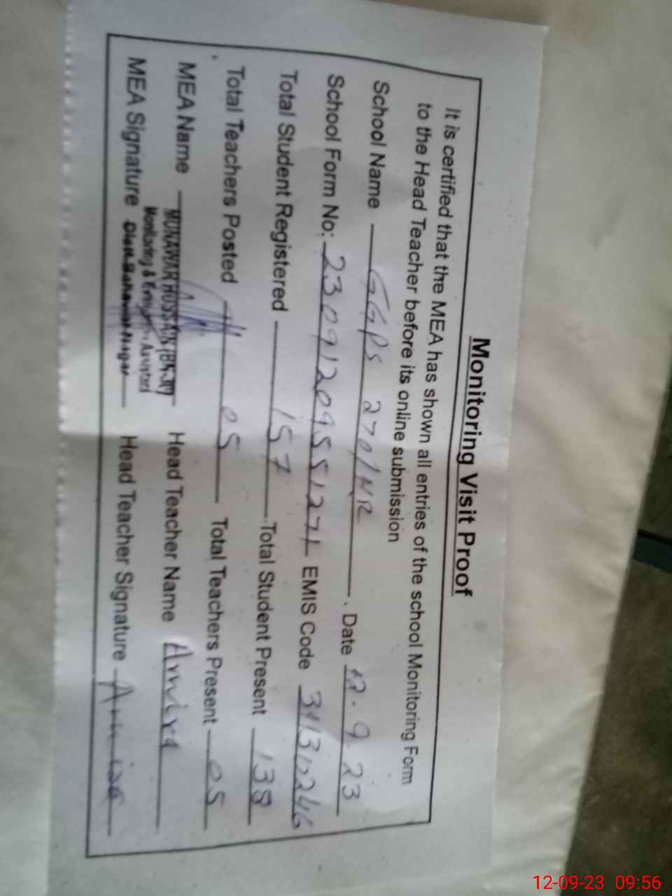 | Attendance Register | Head Teacher | MEA with School | Visit Proof |