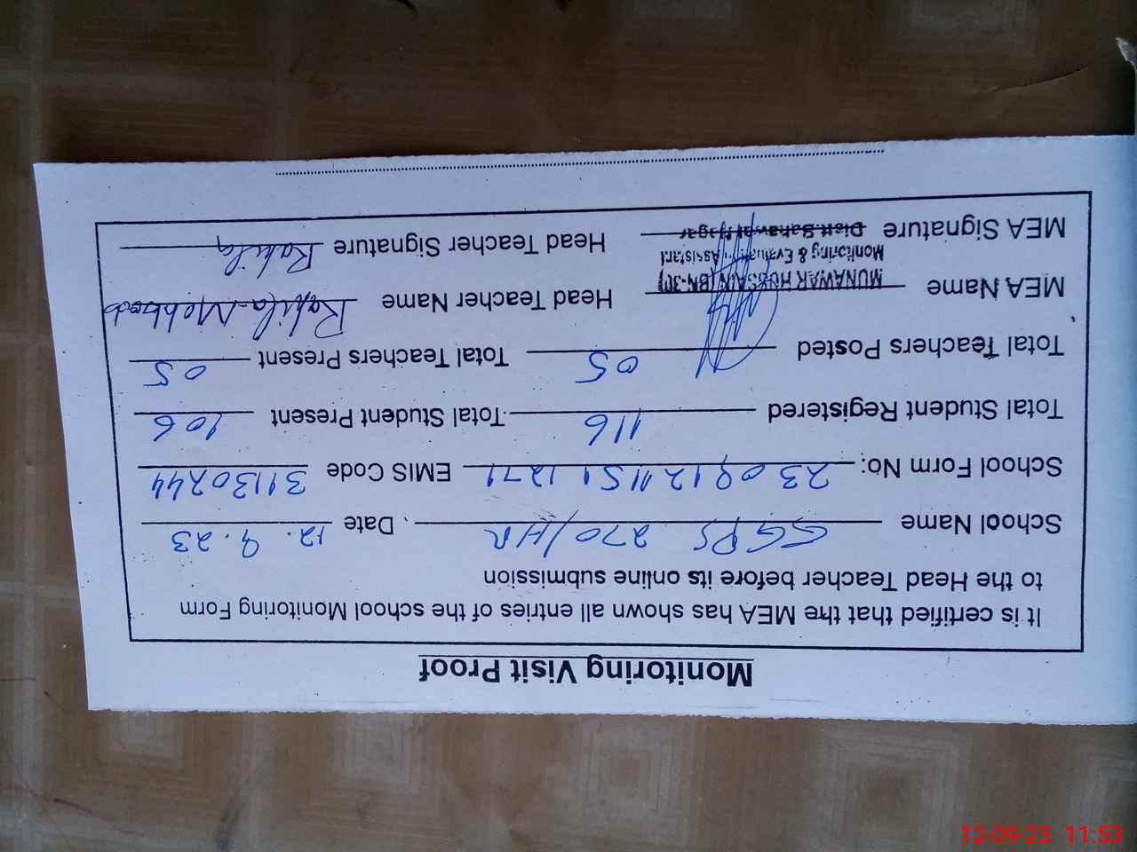 | Attendance Register | Head Teacher | MEA with School | Visit Proof |