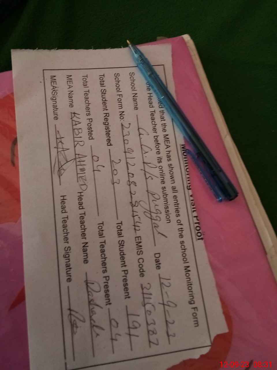 | Attendance Register | Head Teacher | MEA with School | Visit Proof |