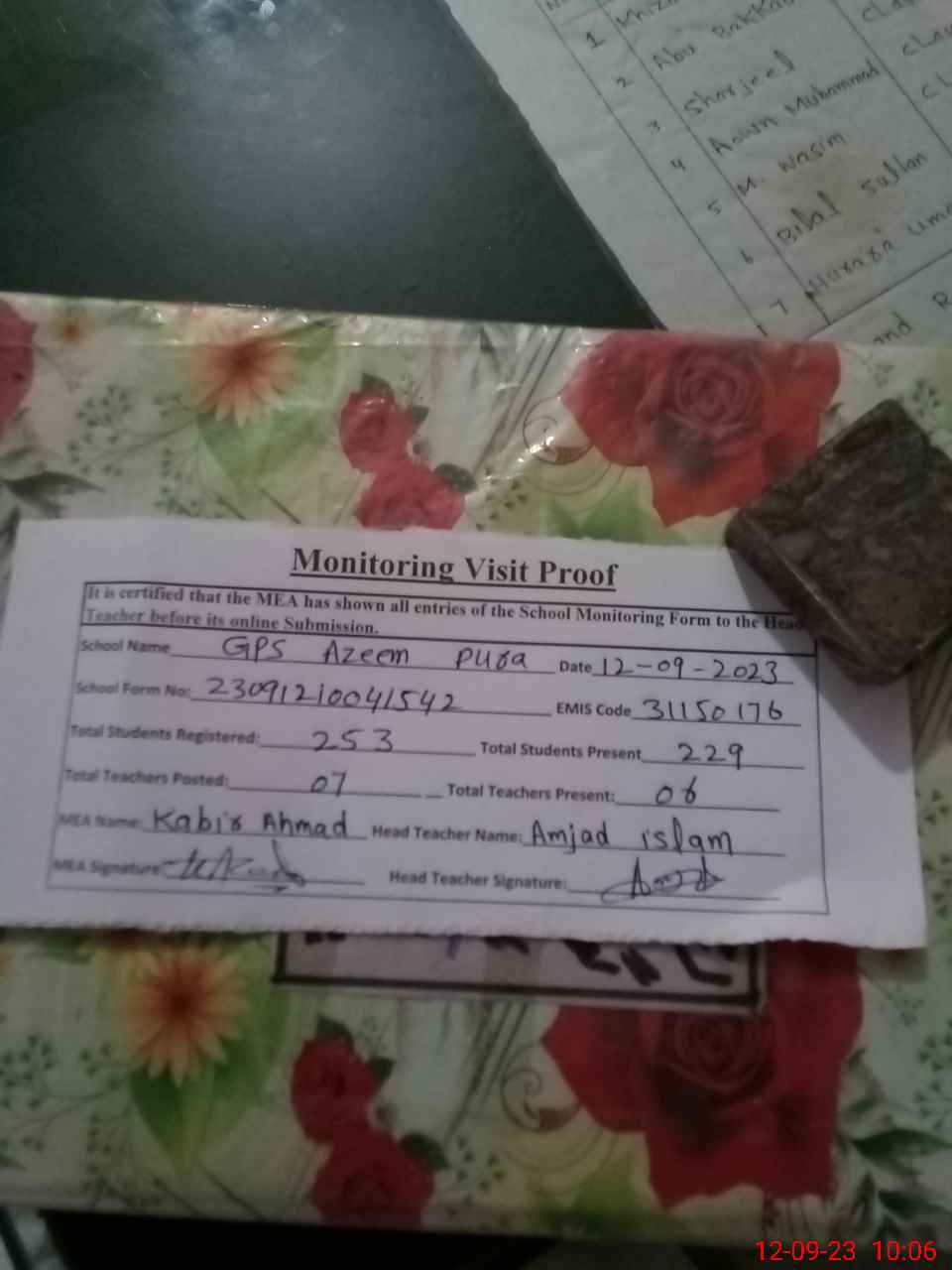 | Attendance Register | Head Teacher | MEA with School | Visit Proof |