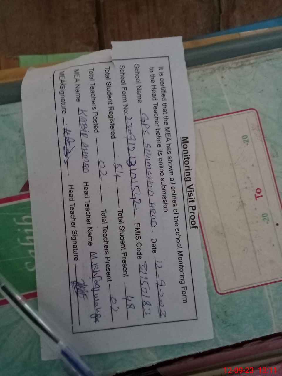 | Attendance Register | Head Teacher | MEA with School | Visit Proof |