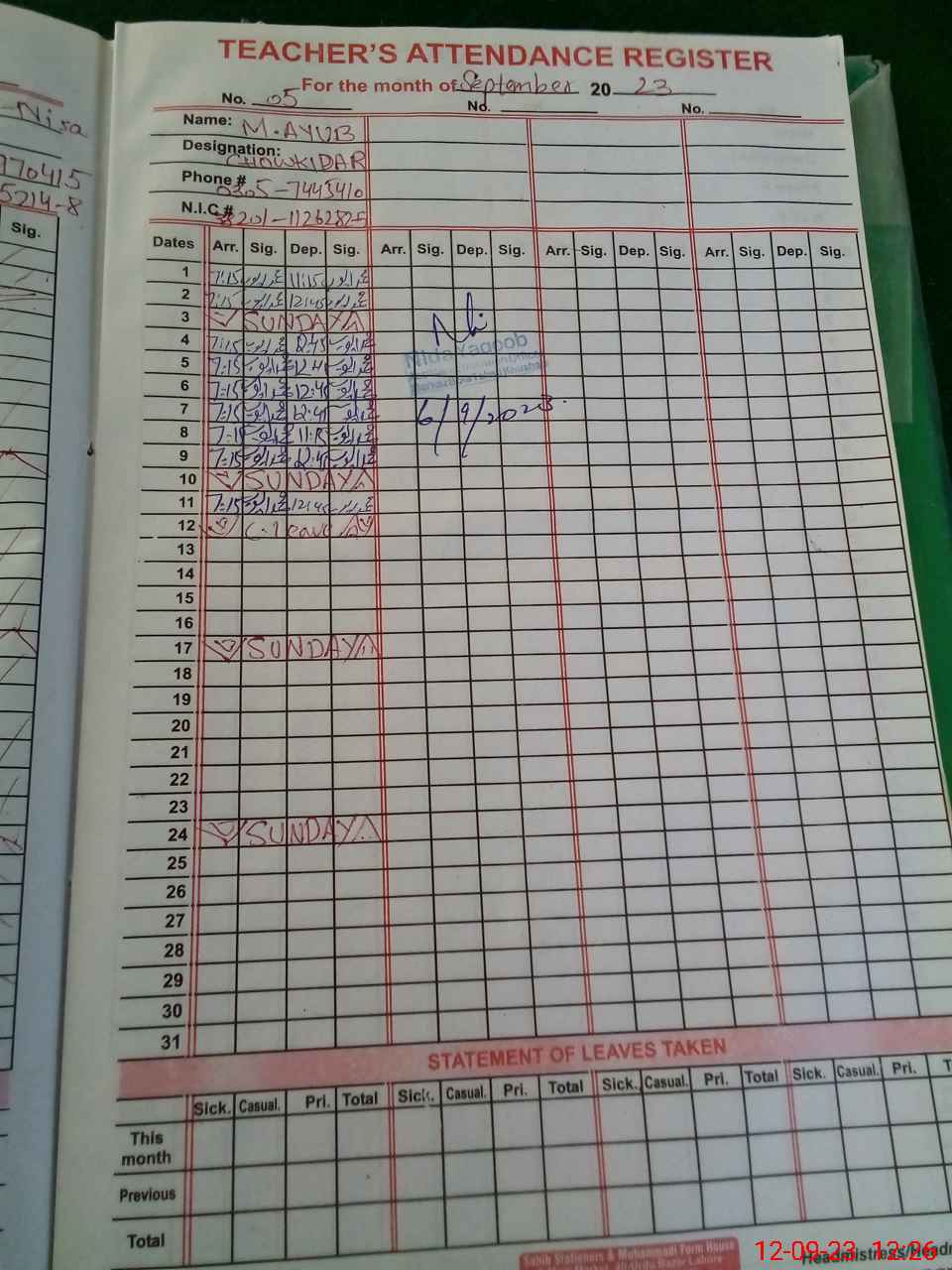 | CNIC | Full Name | Designation | R/C | Absence During Last Calender Month |