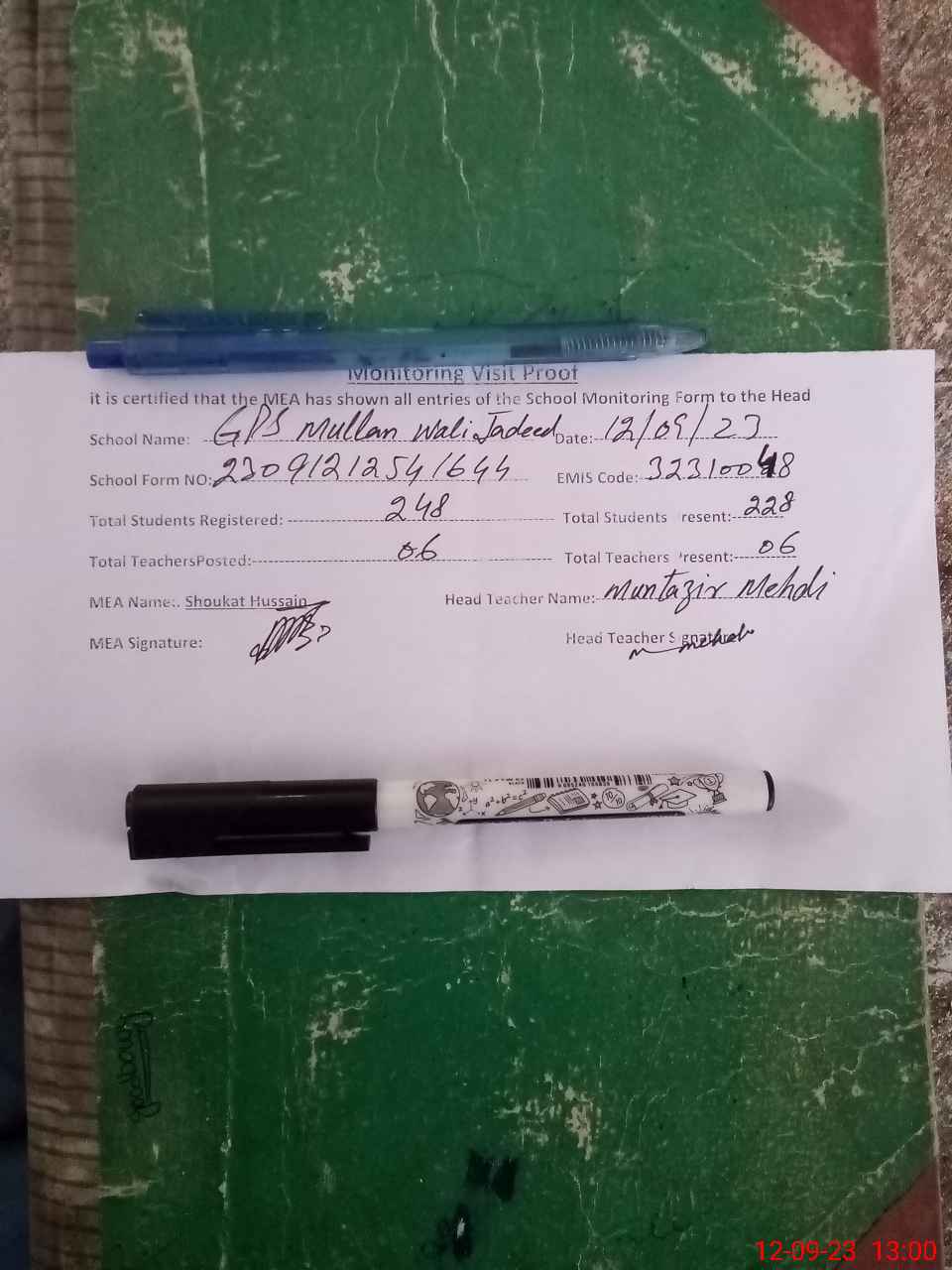 | Attendance Register | Head Teacher | MEA with School | Visit Proof |