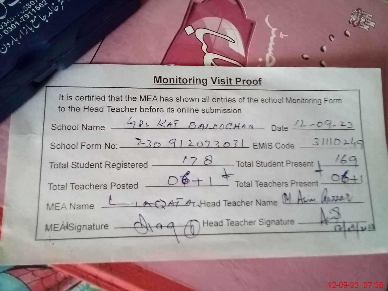 | Attendance Register | Head Teacher | MEA with School | Visit Proof |