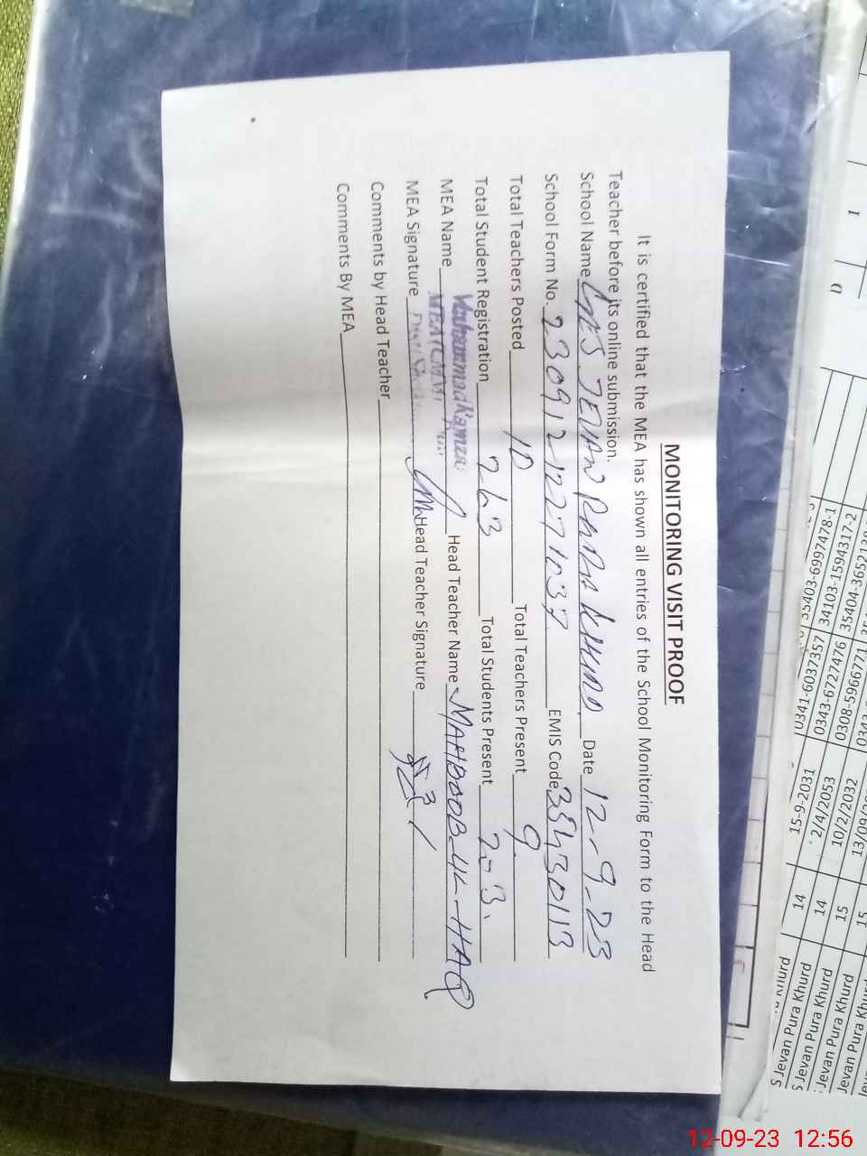 | Attendance Register | Head Teacher | MEA with School | Visit Proof |