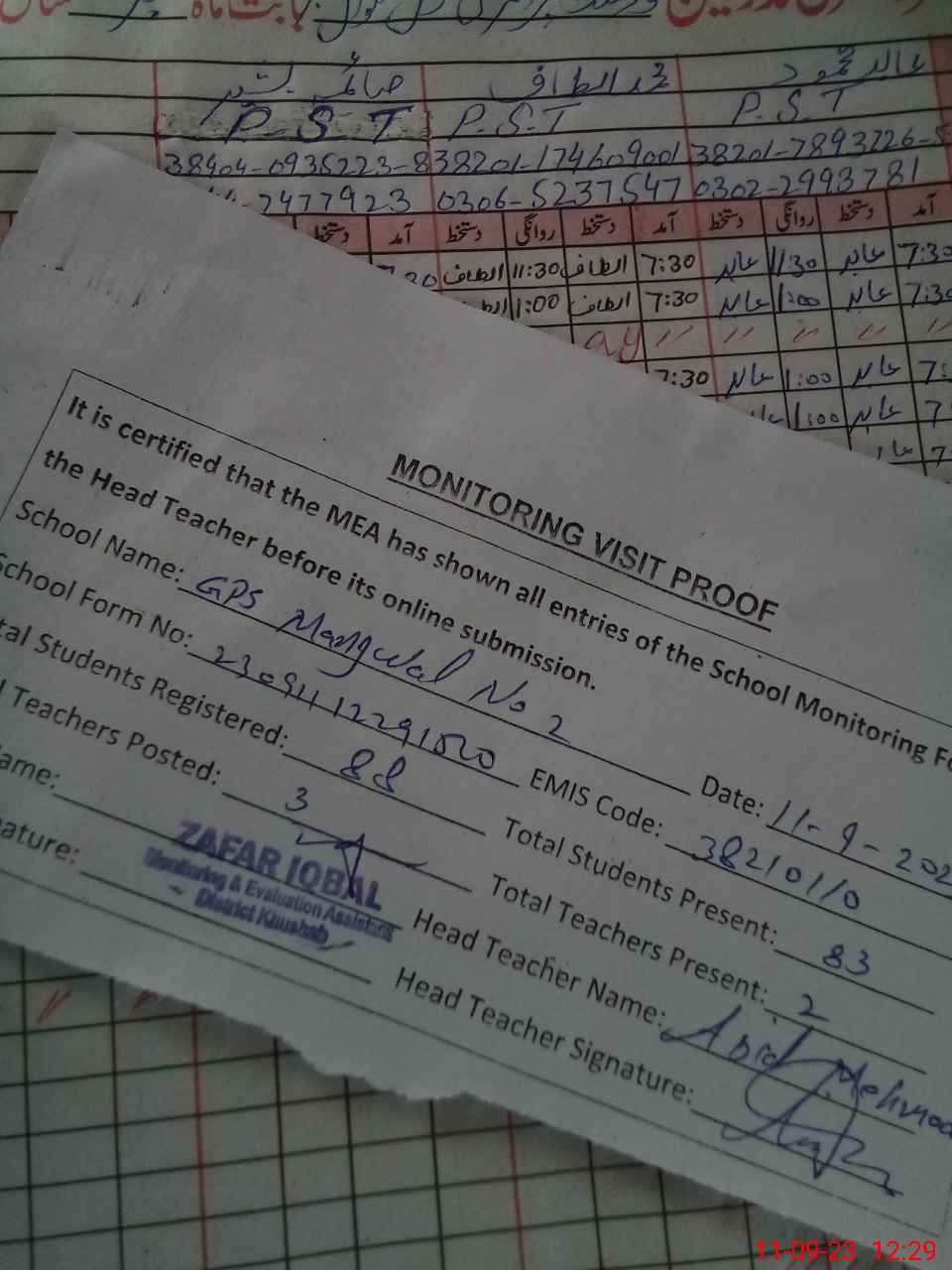 | Attendance Register | Head Teacher | MEA with School | Visit Proof |