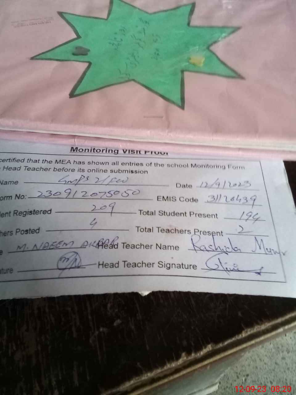 | Attendance Register | Head Teacher | MEA with School | Visit Proof |