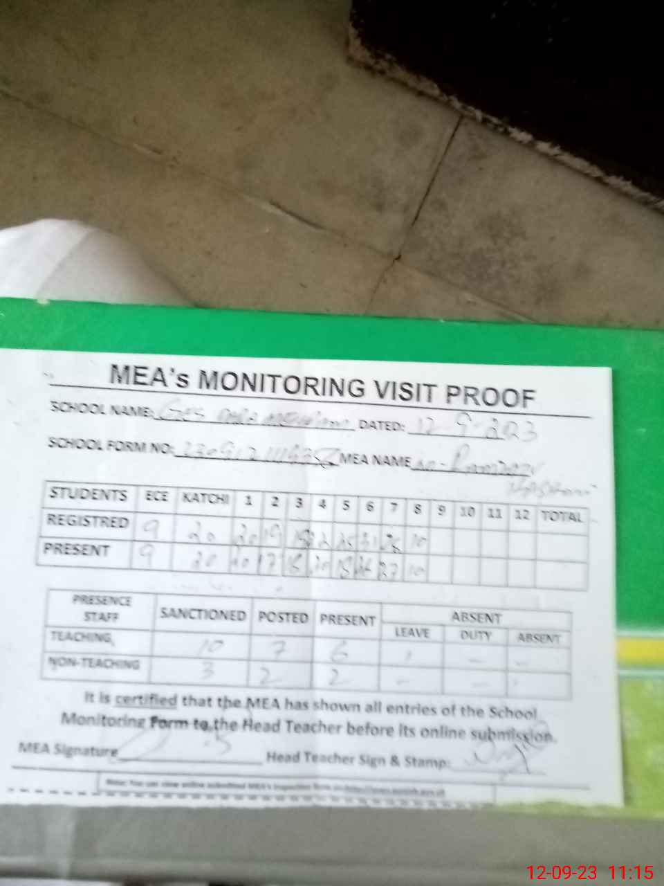 | Attendance Register | Head Teacher | MEA with School | Visit Proof |