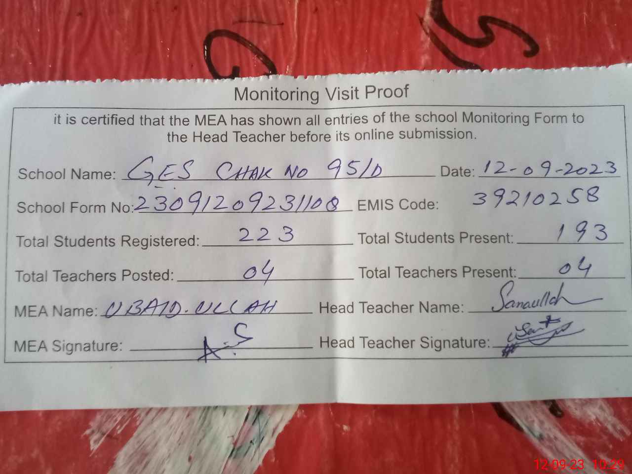 | Attendance Register | Head Teacher | MEA with School | Visit Proof |