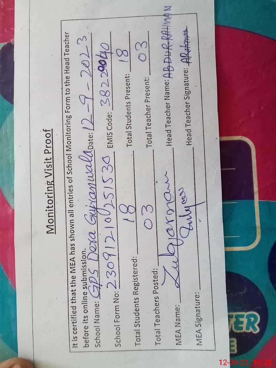 | EMIS Code: 38220040 | Name of School: GPS DERA GUJRAN WALA | |||