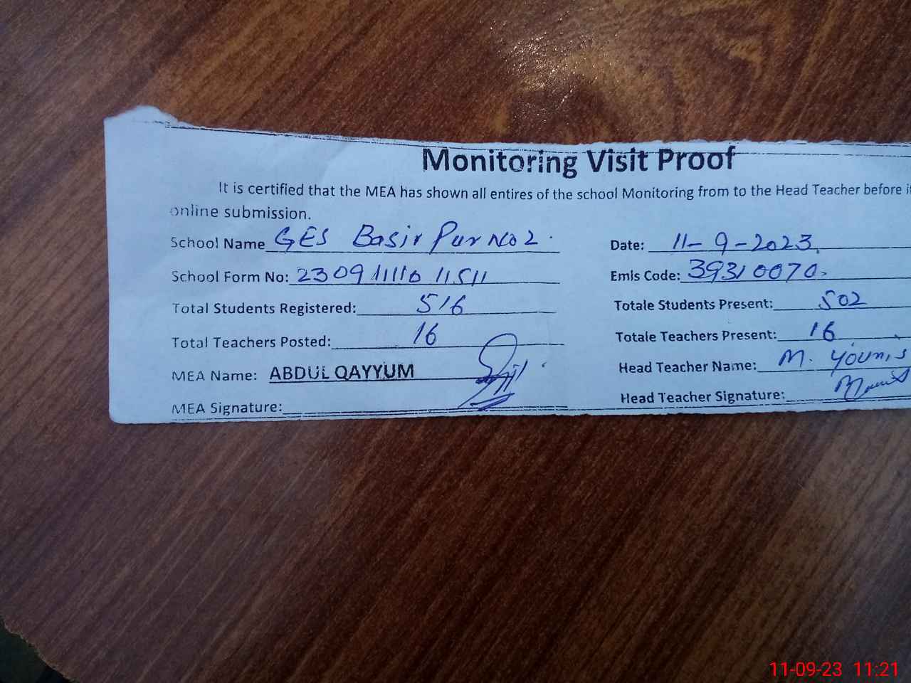 | Attendance Register | Head Teacher | MEA with School | Visit Proof |