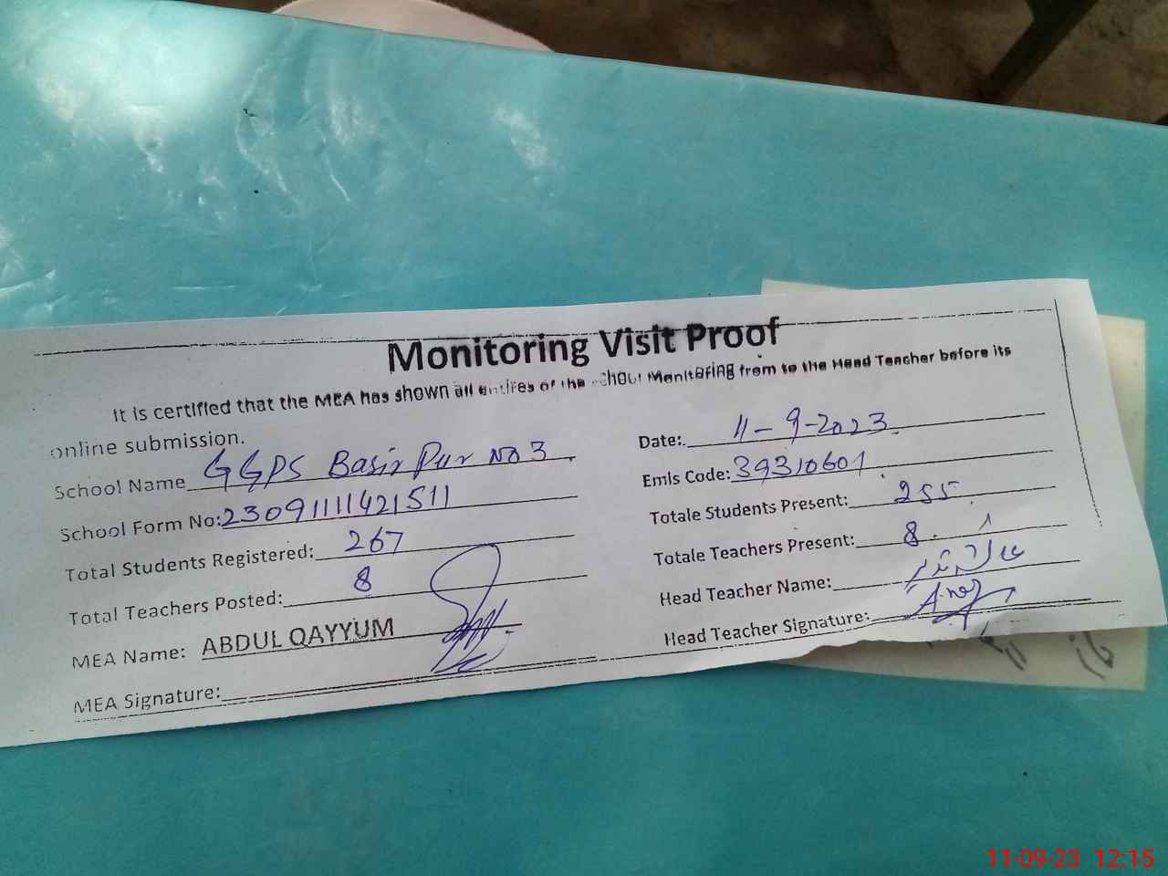| Attendance Register | Head Teacher | MEA with School | Visit Proof |