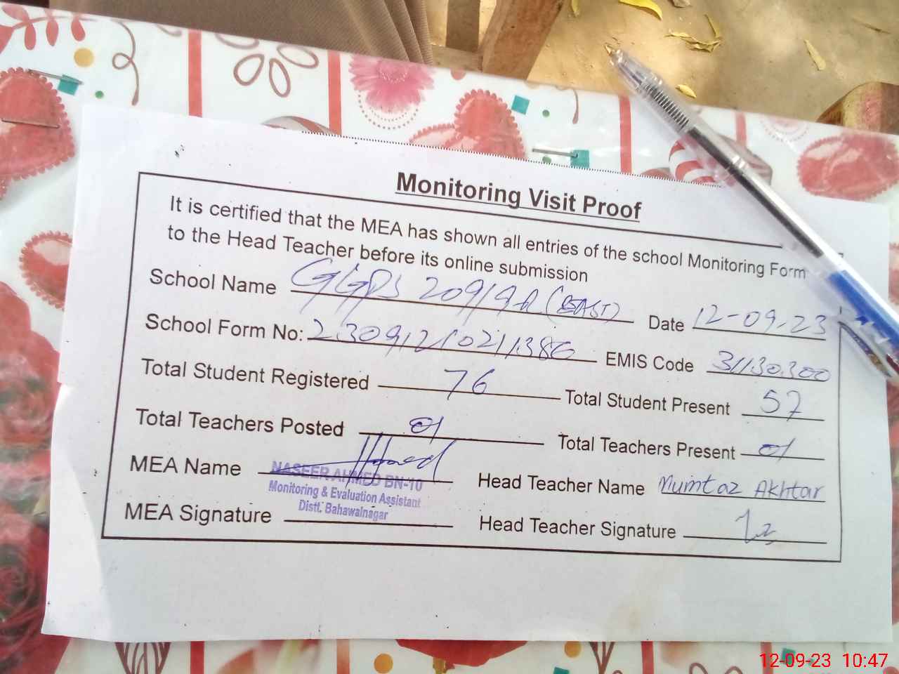 | Attendance Register | Head Teacher | MEA with School | Visit Proof |