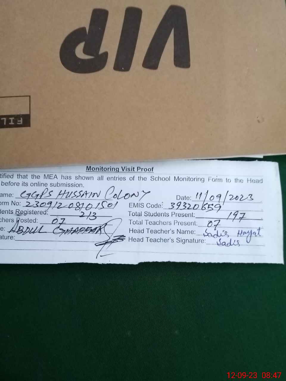 | Attendance Register | Head Teacher | MEA with School | Visit Proof |
