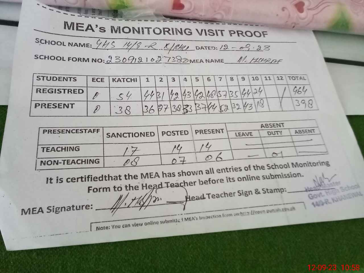 | Attendance Register | Head Teacher | MEA with School | Visit Proof |