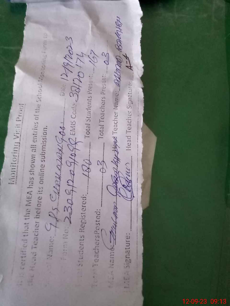 | Attendance Register | Head Teacher | MEA with School | Visit Proof |