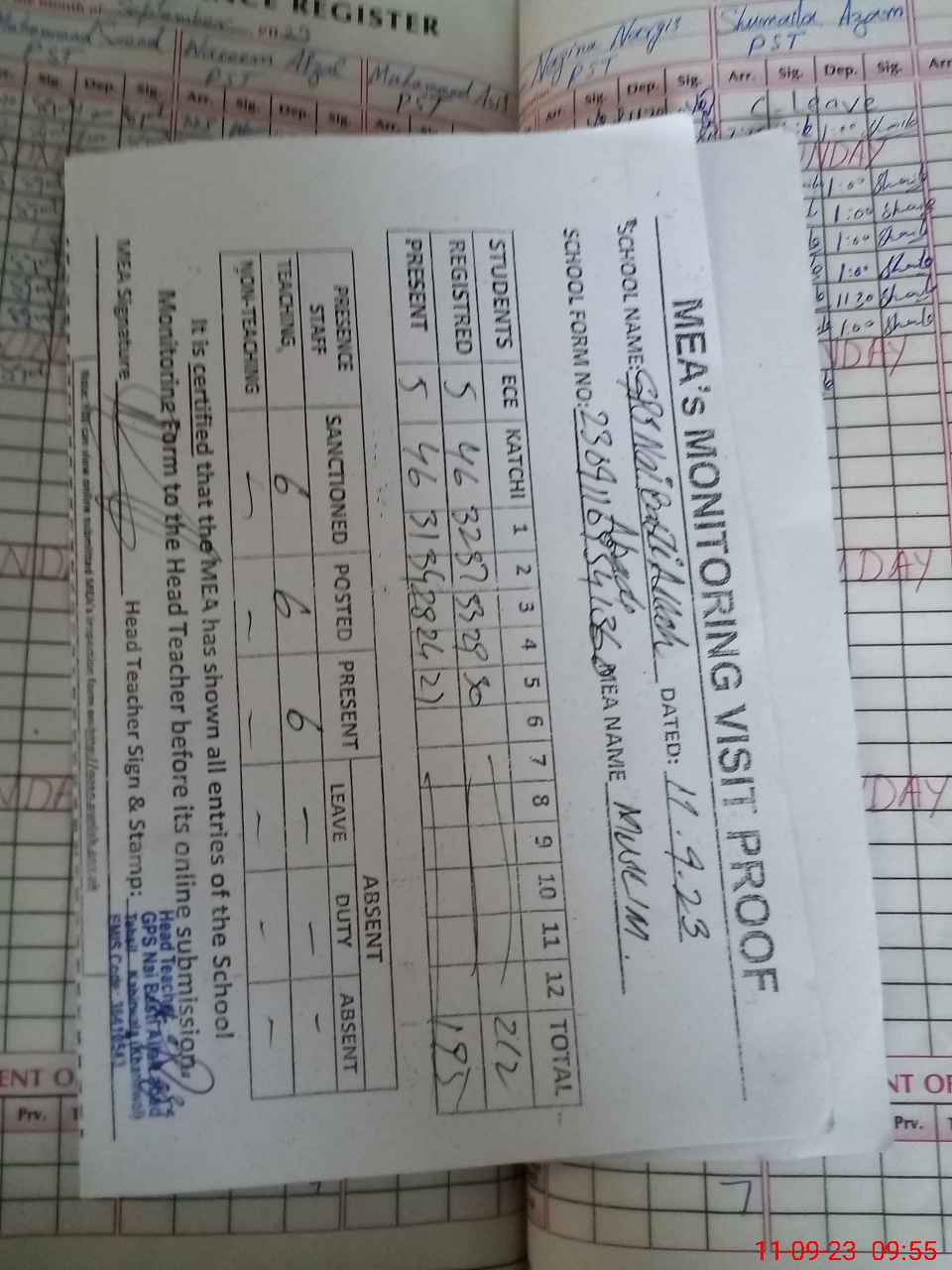 | Attendance Register | Head Teacher | MEA with School | Visit Proof |