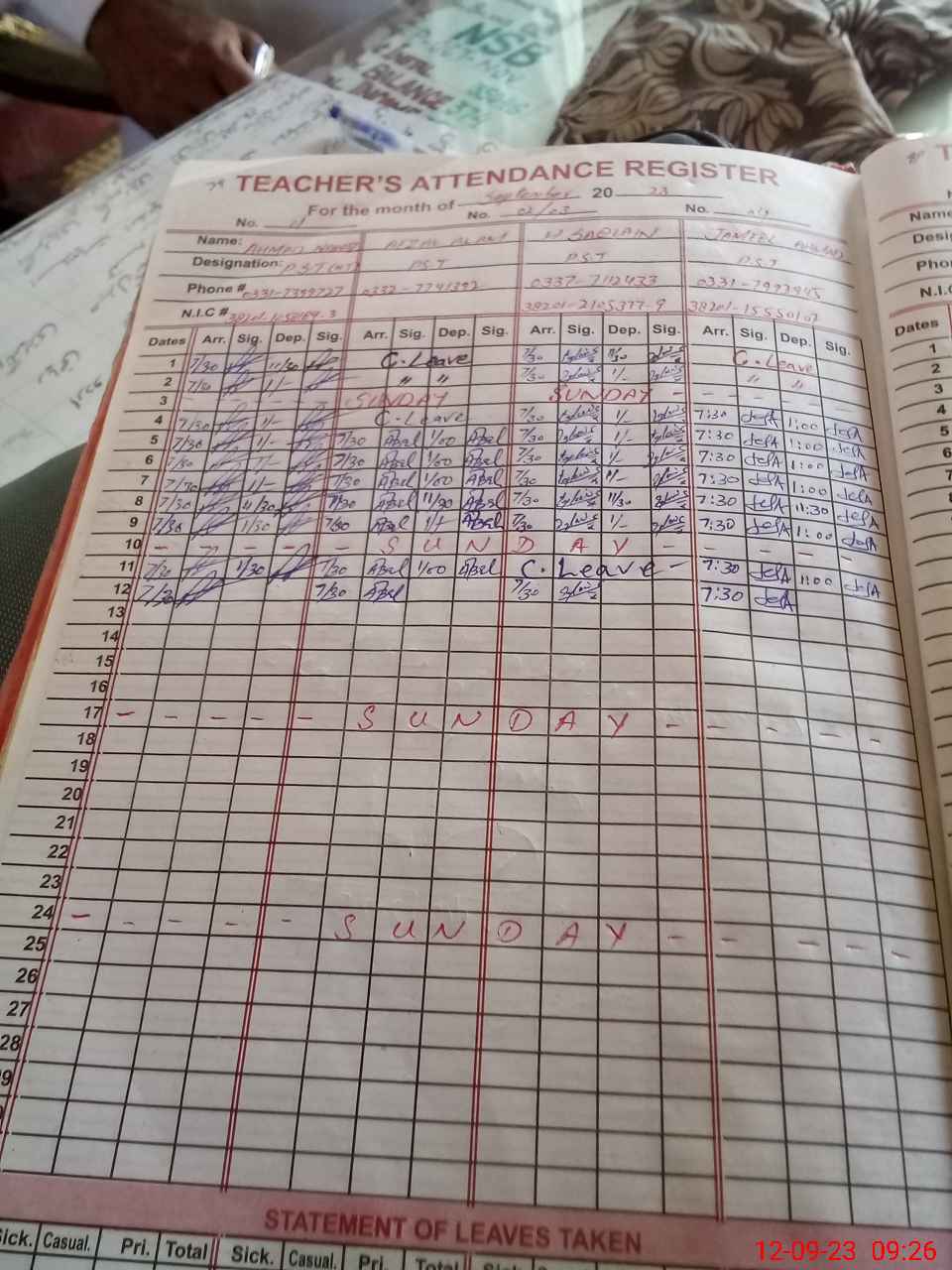 | CNIC | Full Name | Designation | R/C | Absence During Last Calender Month |