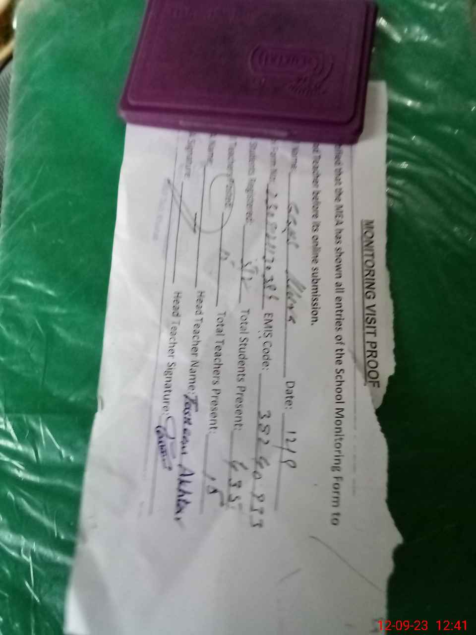 | Attendance Register | Head Teacher | MEA with School | Visit Proof |