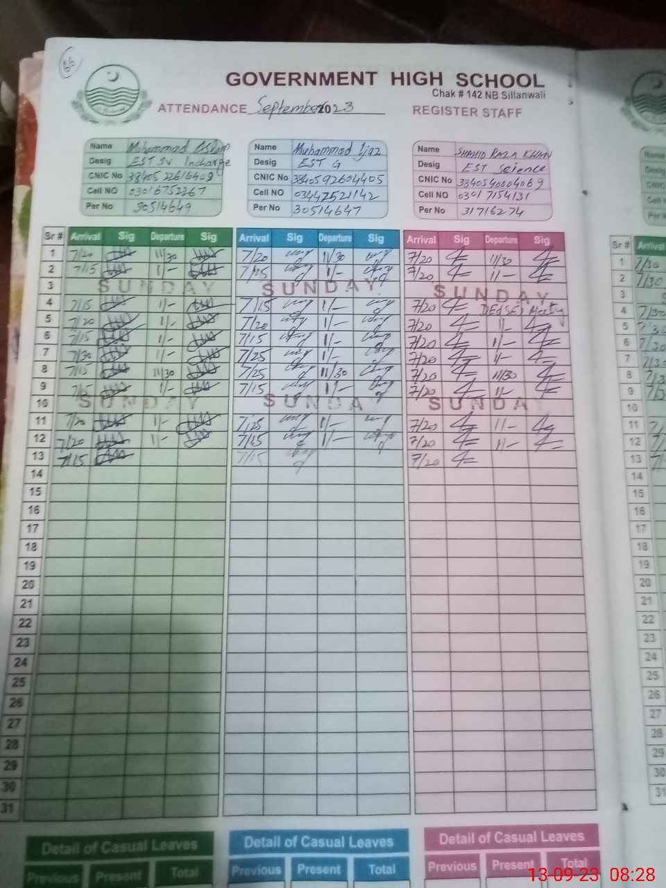 | CNIC | Full Name | Designation | R/C | Absence during last cal. month |