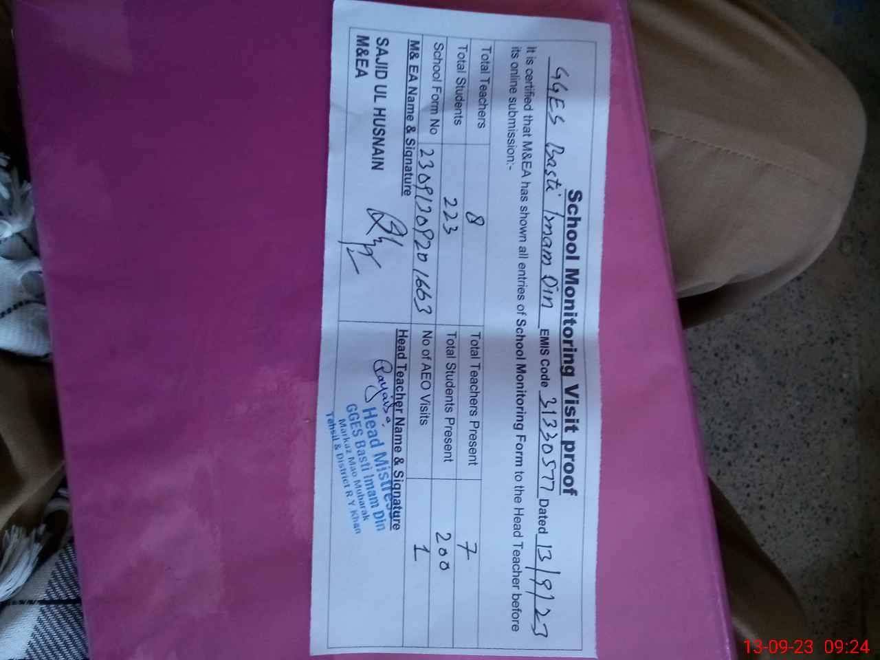 | Name: UZ**** AK**** Designation: (School Headmaster's/Headmistress's) SST Phone/Cell Number: 03**** |