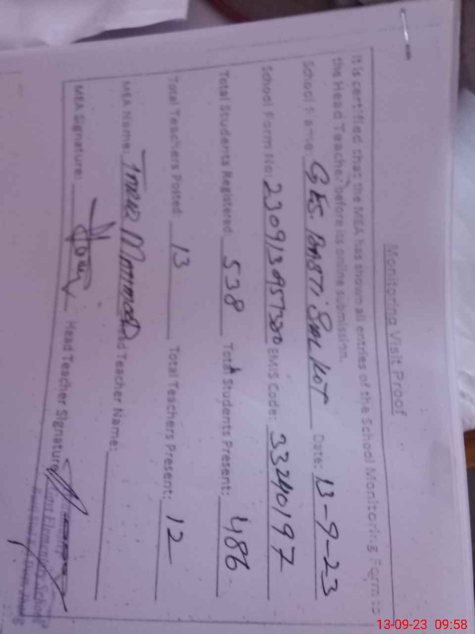 | EMIS Code: 33240197 | Name of School: GES BASTI SIALKOT (Upgraded) | |||