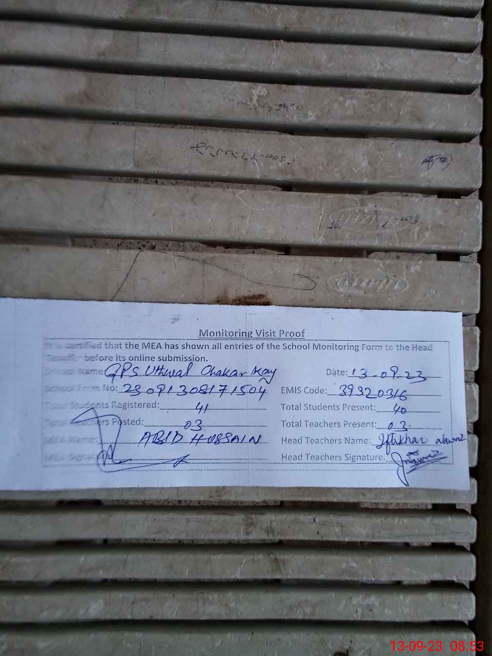| Attendance Register | Head Teacher | MEA with School | Visit Proof |