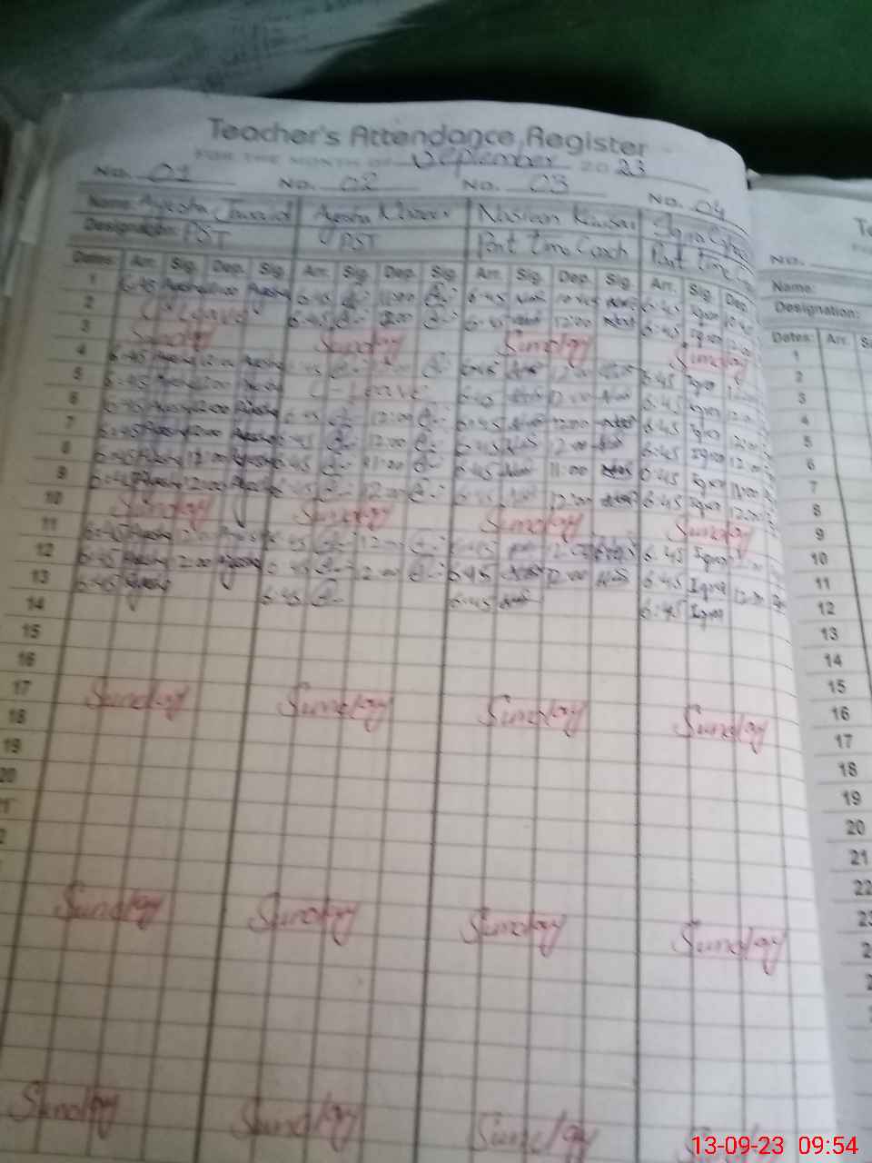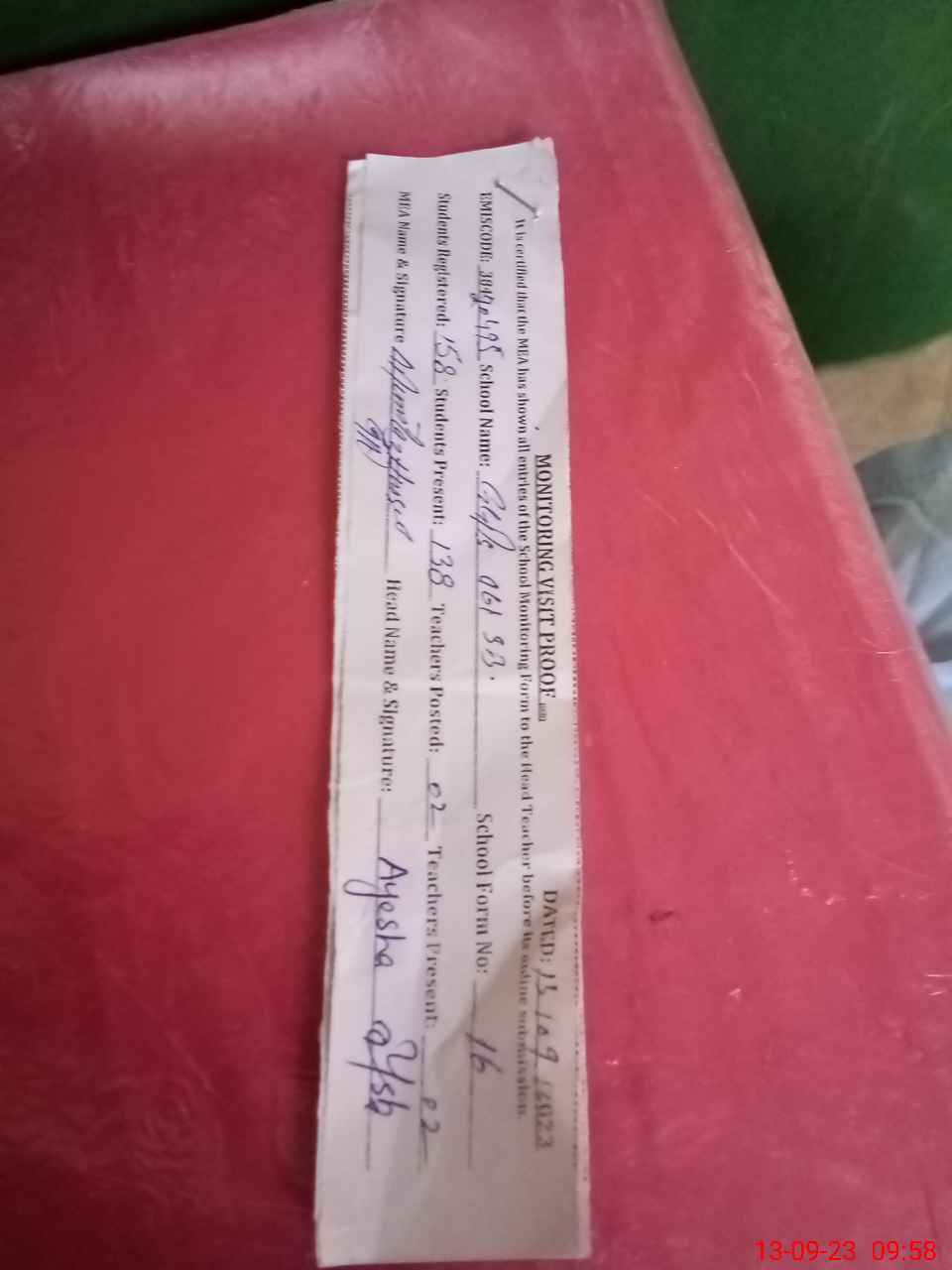 | Attendance Register | Head Teacher | MEA with School | Visit Proof |
